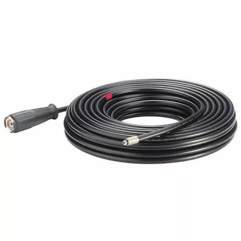 – Long de 30 m, le flexible de nettoyage de canalisations (DN 6) est particulièrement souple, ce qui le rend très efficace lorsqu’il s’agit de nettoyer l’intérieur des tuyaux. (Raccord fileté pour buse R 1/8).