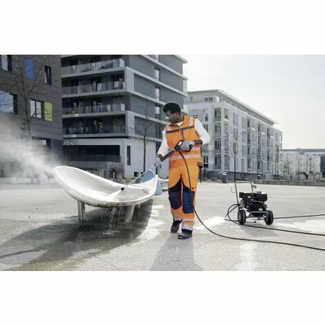 Le nettoyeur haute pression thermique HD 8/23 G Classic nettoie de manière autonome. Son efficacité fait de lui l’appareil idéal pour les secteurs du bâtiment, industriel et agricole.Partout où les sources d’énergie externes ne sont pas disponibles et où les tâches de nettoyage sont néanmoins exigeantes, notre nettoyeur haute pression à eau froide HD 8/23 G Classic avec moteur à essence UE STAGE V est le choix idéal. Avec une quantité d’eau par heure de 800 litres, une pression de travail de 230 bars et une pompe à vilebrequin robuste, l’appareil maîtrise également les tâches de nettoyage difficiles avec fiabilité. La poignée ergonomique, le rangement pour accessoires pratiques, les dimensions compactes et les roues increvables font du HD 8/23 G Classic un appareil extrêmement simple à utiliser, mobile et en plus facile à transporter en voiture. L’appareil se distingue également par ses composants facilement accessibles qui sont protégés de manière efficace par un grand filtre à eau ainsi que par une valve thermique et une soupape de sécurité. Pour éviter les dommages causés par des influences extérieures, l’appareil est doté d’un châssis tubulaire en acier extrêmement robuste. Il est donc parfaitement adapté aux nettoyages difficiles dans les secteurs du bâtiment, de l’industrie et de l’agriculture.CaractéristiquesIndépendance : Indépendant de source électrique extérieure STAGE V, conforme aux exigences de la norme EU sur les émissions de gaz d’échappement . Démarrage manuel pratiqueGrande mobilité : Roues anti-crevaison garantissant une grande mobilité. L’appareil compact très facile à manœuvrer, même dans les passages étroits. Grande mobilité, transport facile et rangement peu encombrant – se stocke dans un véhicule standard.Robuste et d’une grande longévité : Un châssis tubulaire en acier robuste protège l’appareil de manière fiable contre les dommages. Des technologies de sécurité éprouvées telles que la soupape thermique et de sécurité et le filtre à eau. Pompe à vilebrequin avec pistons en céramique.Données techniquesDébit (l/h) : 800Pression de service (bar/MPA) : 230/23Pression maximum (bar/MPA) : 280/28type d’entrainement : Essence Motorisation : G300FANombre d’utilisation simultanés : 1 Qualité : haut Poids ( avec accessoires ) (kg) : 48.4Poids ( emballage inclus ) (kg) : 56.4Dimensions (L x l x h ) (mm) : 878 x 538 x 702