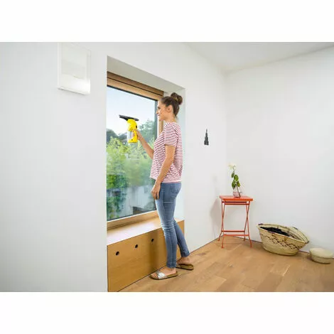 – Compact et prise en main facile : Avec le petit appareil pratique, le nettoyage de surfaces lisses deviendra maintenant encore plus facile. L’aspirateur sans fil pour vitres Kärcher n’a aucun mal à atteindre le rebord inférieur de la fenêtre.